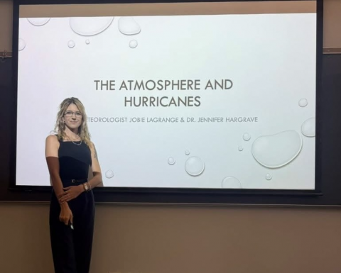 Wed, 10/01/2025 - 7:52amKATC Meteorologist Jobie Lagrange visited Hamilton Hall to give a guest lecture about hurricanes for students in Introduction to Earth Science (GEOL 225).